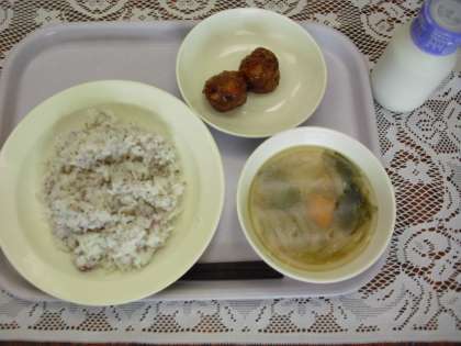 今日の献立は、ゆかりご飯、牛乳、肉団子の甘酢あんかけ、味噌汁です。
