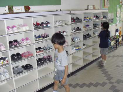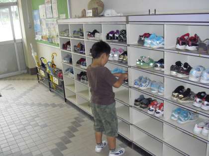 今日は、昼休みの途中に雨が降ってきました。教室や図書室に戻っていました。昇降口を通りかかると、1年生の3名が・・・靴の入れ方のがずれているところを整理していました。