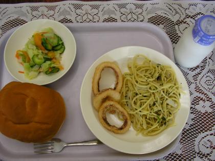 今日のメニューは、ミルクパン、牛乳、イカのリングあげ、スパゲティバジリコ、フレンチサラダです。