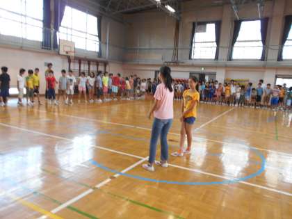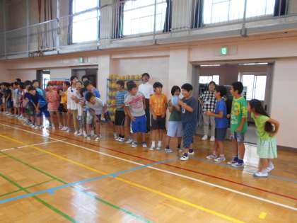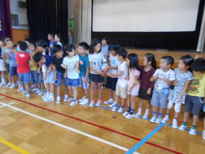 今日の児童集会は恒例の爆弾ゲームです。爆弾に見立てたポールを回していきます。音楽が鳴り終わったときにポールを持っている人は一回お休みになります。集会委員が手際よく進めてくれました。
