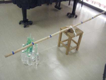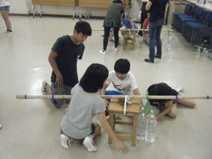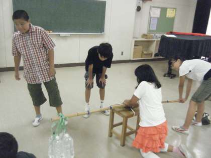 子どもたちは「てこ」という道具があることを知り、実際に、8Lの重さがあるペットボトルを、てこで持ち上げてみました。