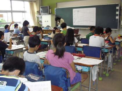 4年生の教室では、1時間目の社会科の学習・・・ゴミの行方の学習を各自が新聞にまとめことを全体で確認していました。