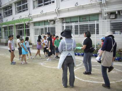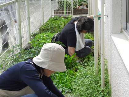飼育栽培委員会は、ゲストティチャー(親鳩の会:卒業生の保護者・九品仏小の支援団体です。)ゲストティチャーの方が花壇の作業をしている場面・子どもとあいさつをしている画面です。
