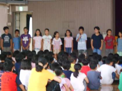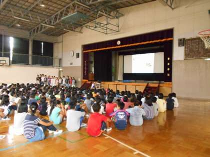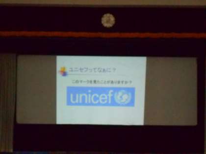 9月16日〜27日のユニセフ募金に先立ち、ユニセフ募金の意義や歴史を知らせる集会をしました。前期の代表委員全員が順番に話をしました。また、「知ろう!世界のすがた 協力し合えば 一つの命を大事にできる」と今回の九品仏小学校の募金のスローガンを発表しました。
