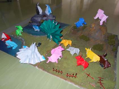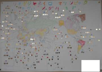 2年生の夏休みの自由研究を紹介いたします。上の写真はジオラマ模型で、自分で設計図を描き、材料も集めた自信作です。中の写真の「そらとぶふしぎないきもの」と題した工作は、自然の素材を上手に生かした力作です。下の写真の作品は、リオオリンピックでの各国の獲得メダル数を世界地図上で示し表現を工夫しています。