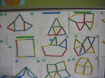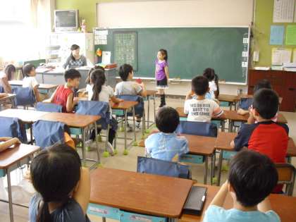 2年生の教室では、“朝の会:1分間スピーチ”ビーズで遊んだことを話していました。算数で学習したいろいろな形が立体的に掲示してありました。