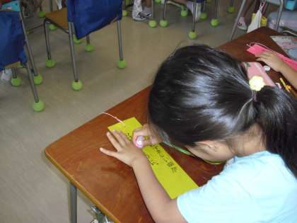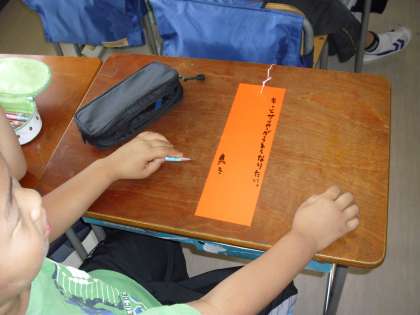 3年生の教室では、地域の商店会の協力で、“七夕の短冊に願いを書いていました。”