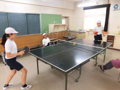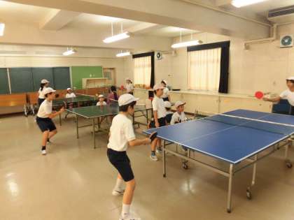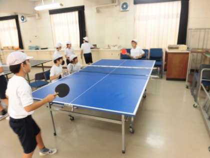 卓球クラブでは、4・5・6年生が仲良くかかわり合いながら試合をしています。
