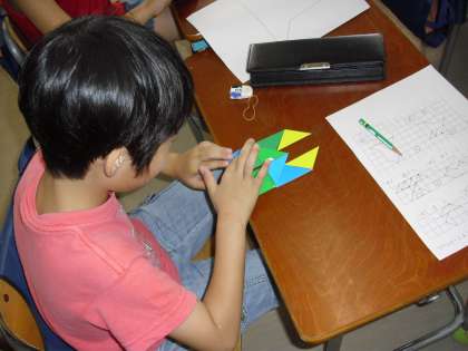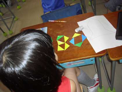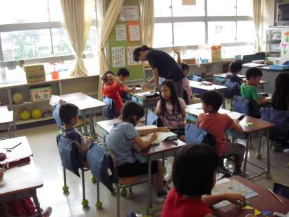 2年生の教室では、“算数”いろろな形の学習・・・・できた子供の確認に先生が行っています。
