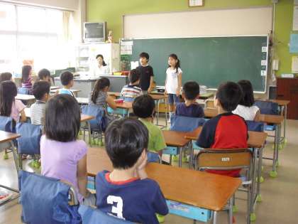 2年生の教室では、朝の会で日直が相談して、朝の会の進行をします。また、1分間スピーチでは、“おうちのお手伝い:お風呂そうじ”のことを話していました。