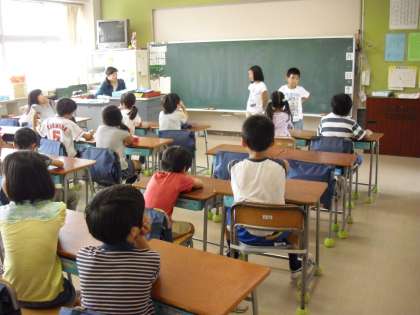 2年生の教室では、朝の会で1分間スピーチを行っているところです。学校ごっこをして遊んだことを話していました。
