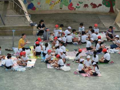今日は青空給食の日でした。それぞれのクラスで話し合いをして場所を決め、屋上や校庭にお弁当形式の給食を持って行って食べました。