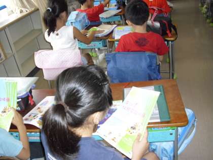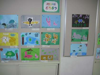 2年生の教室では、配布物の説明をしていました。廊下には、図工で作成した作品が掲示してありました。