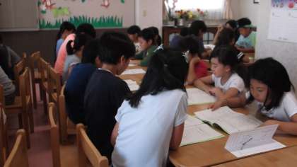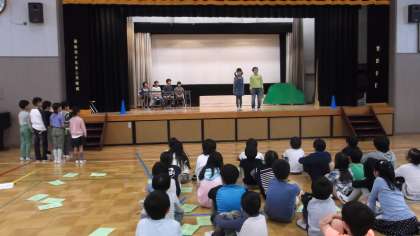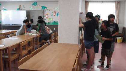 ランチルームで、役ごとに、台詞の分担などを決めました。その後全体で、第1回読み合わせをしました。10月28日に、初めて、体育館で舞台を使って練習をしました。