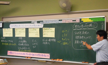 課題についての子どもたちの発表の合間に前時の学習の振り返りや的確な内容補足があった。このような指導は、本時の学習と様々な知識を結びつけ、高学年の児童にとって大切な学習の広がりとなる。