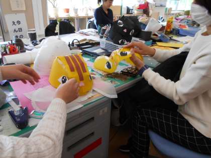 今日は土曜授業日で、午前中の授業が終わった後、1年生の担任は早速、学芸会の小道具作りに励んでいました。ことばの教室の担任も一緒になって、1年生全員の「かぶりもの」を作成していました。