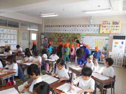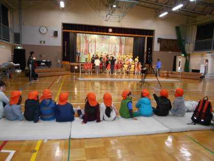 今日の学芸会のリハーサルに「等々力保育園分園このは」の年長児の皆さんが鑑賞に来てくれました。1・3・5年生の劇を見た後、少しだけ1年生の学習の様子も見学しました。1年生はお兄さん・お姉さんの気分を味わいました。