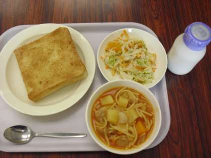 今日の献立は、シナモントースト、牛乳、ミネソタスープ、キャベツサラダです。