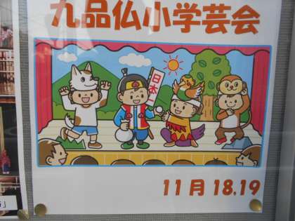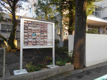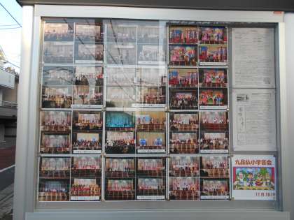 正門近くの掲示板は折々の子どもたちの活躍の姿を紹介しています。よく近隣の方や子どもたちが足を止めてくださいます。今は先週の学芸会の写真を掲示しています。掲示板はホームページとともに学校の窓となっています。