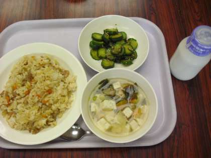 今日の献立は、キムチチャーハン、牛乳、わかめスープ、やさいの中華漬けです。