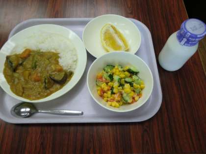 今日の献立は、夏野菜カレー、牛乳、トロピカルサラダ、くだものです。