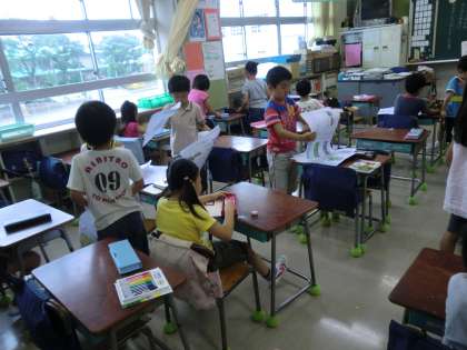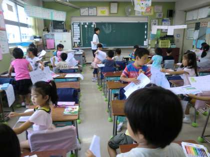1年生は、学習のまとめのテストが終わり・・係の子どもが集めているところです。