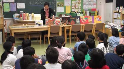 2冊の絵本の読み聞かせと素話を1つ楽しみました。最後に、学校の図書室にある今回のお話に関連した本を、図書館司書の松沢さんに紹介していただきました。
