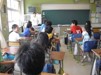 5年生は、朝の会で先生の話・・・画面の子どもは、“手作り:誕生カード”を持っていました。
