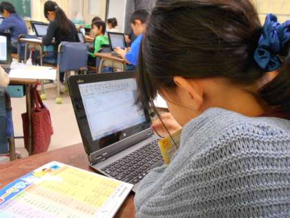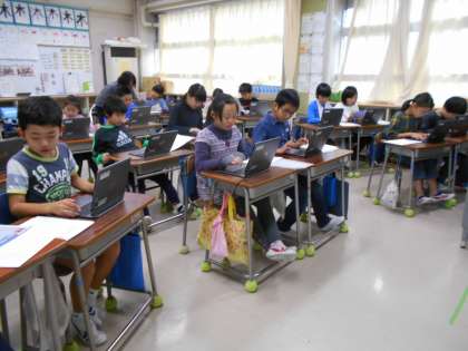 3年生はタブレットパソコンを教室は運んで、ローマ字での文字入力の練習をしました。拗音などの入力に苦労していましたが、ローマ字表を片手に真剣に取り組んでいました。