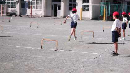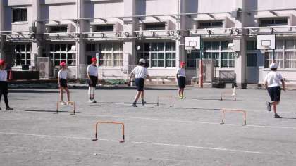 小型ハードル走の学習を始めました。今日のめあては、「一定の間隔に並べられた小型ハードルを同じ歩数、一定のリズムで走り超える。」でした。まず、ラインを活用して、5歩のリズムで走り抜く練習をしてから、実際に、ハードルの走り超えをしました。