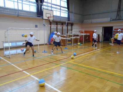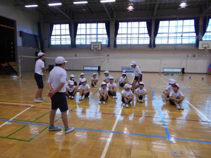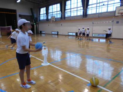 インドアスポーツクラブは、体育館で行う球技やバトミントンなどの種目を楽しむクラブです。縦割り班でチームを組み、互いに技術の向上のために教え合って活動しています。