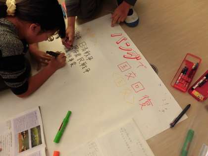 2組では、国ごとのグループに分かれて調べたことをポスターにまとめました。