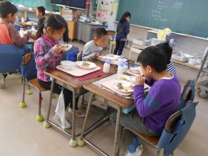 本校の給食の材料は、学校の周りのお店にお世話になっています。お米は、学校の近くのお米屋さんが精米したてのものを届けてくださるので、とても美味しいです。また、お豆腐は、駅の近くのお豆腐屋さんが国産大豆のてづくりのものでこちらも逸品です。この他、お肉・調味料・野菜も学校の近くのお店が届けてくださいます。