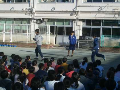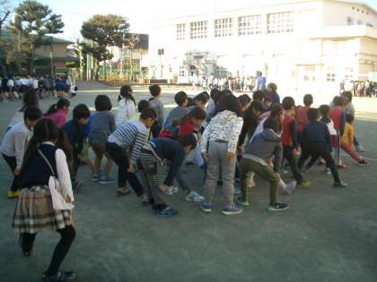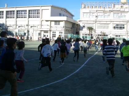 本校は「マラソンタイム」を火曜日に設定して、体力の向上を目指しています。全校共通の学習カードを使って体育の時間や休み時間にも、学級ごとにマラソンに取り組んでいます。