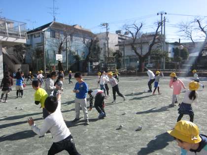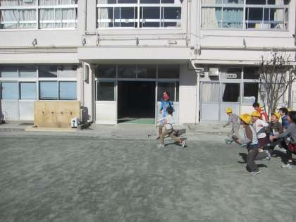 今日は、節分の日なので5時間目の学活では、1.2年生で校庭に出て、豆まきをしました。