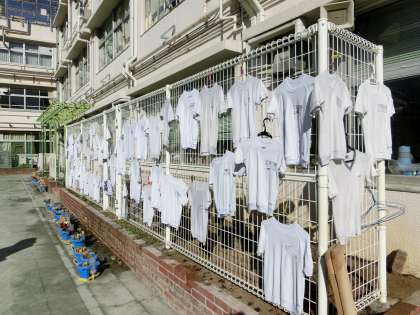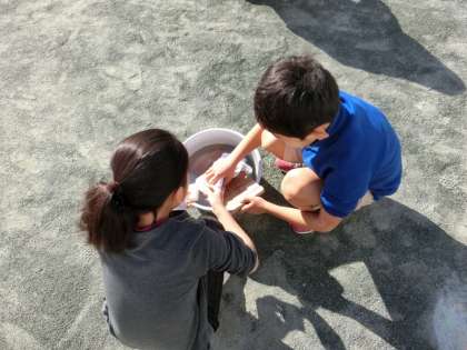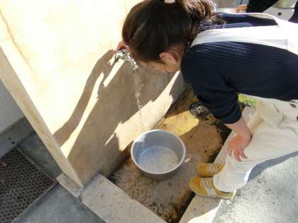 たらいに水を汲んできて、洗濯板と石けんを使って、体育着を洗いました。