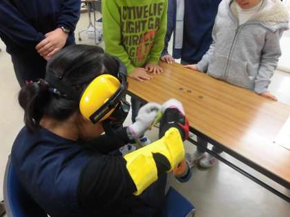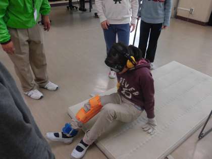 サポーター・おもり・ゴーグルなどをつけて、80才くらいの高齢者になったような体験をしました。