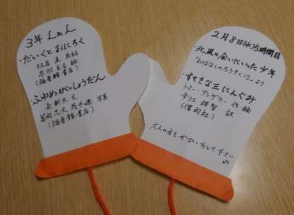今日は月に一度の読み聞かせでした。作品は「だいくとおにろく」「ふゆめがっしょうだん」「すてきな3にんぐみ」の読み聞かせと「北風に会いに行った少年」の朗読でした。