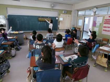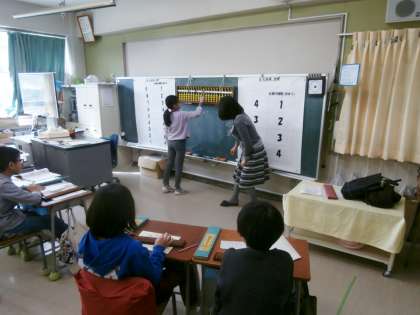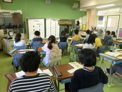 2月6日と8日は珠算教室の遠藤先生にそろばんを教えていただきました。玉の入れ方、たし算、ひき算を教えていただき、5の補数、10の補数を使って、たし算、ひき算をすることが分かりました。