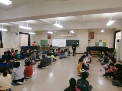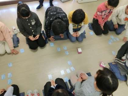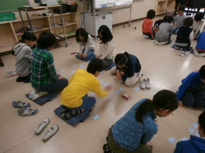 今日は3,4年生合同で百人一首大会をしました。縦割り班の3、4年生がペアになって対戦しました。3年生は今年度初めて百人一首に取り組み、毎日の音読練習で少しずつ覚えてきました。4年生はすぐに取れる子も多く、班の中でいろいろな子と対戦できるように考えてペアを組んでくれました。