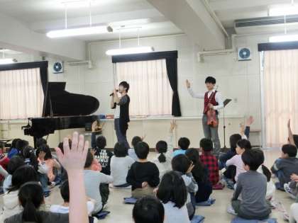 手拍子でリズムを取ったり、ステップを踏んだり体をたくさん動かして聴く曲もあれば、座って目をつぶって聴く静かな曲もありました。近くでバイオリンの音色を聴くのが初めての子も多く、演奏に聴き入っていました。