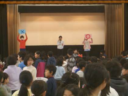 9日の朝の時間に児童集会「○×クイズ」を行いました。学校にまつわる問題を集会委員会の児童が考え、出題しました。○か×かの2択ですが、制限時間ぎりぎりまで迷う児童も見受けられました。集会委員会が企画・運営・当日の司会などを全て担当しました。