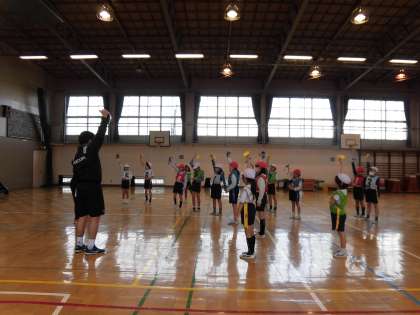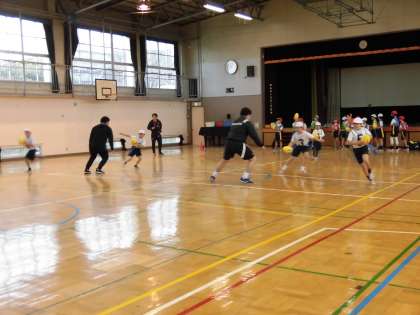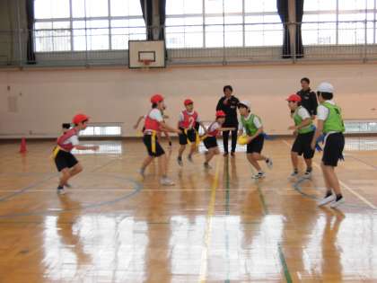 体育の学習で、タグラグビーに取り組みはじめました。23日には、ゲストティチャーとしてリコーブラックラムズ(ラグビートップリーグチーム)さんに、来ていただきました。まず、タグの正しい付け方や、相手のタグを取った時のリアクションや、自分がけがをしたり、相手にけがをさせたりしないための基本のルールなどを教わりました。その後、各クラスとも4つのチームに分かれて、ミニゲームを楽しみました。