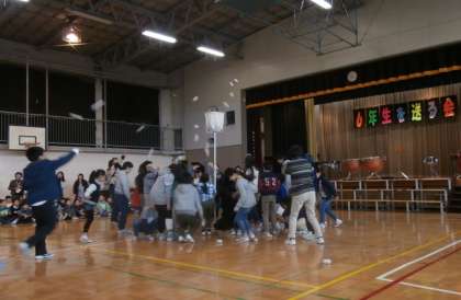 4日の6年生を送る会で、3年生はチェッコリ玉入れをしました。6年生が1年生のときの運動会でした思い出の玉入れです。3年生の動きに合わせて6年生もいっしょにおどってくれて楽しく玉入れをしました。