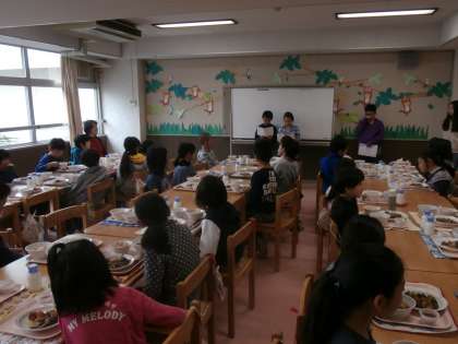 3年生最後の給食はランチルームで、学年のみんなで食べました。3学期、ランチルーム給食とお弁当給食は学年で一緒でした。