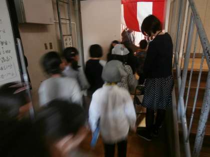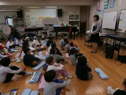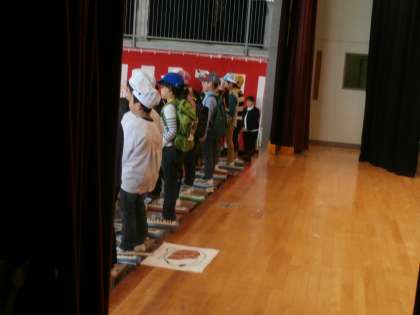 今日の入学式で2年生は歓迎の出し物をしました。1年生へのお祝いの気持ちをこめて、九品仏小学校のよいところを紹介しました。