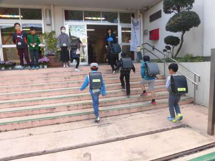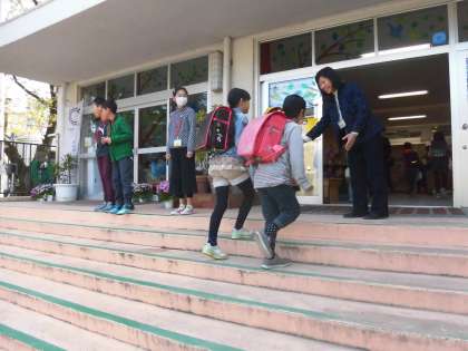 九品仏小学校伝統のあいさつマン、今年度も活躍しています。