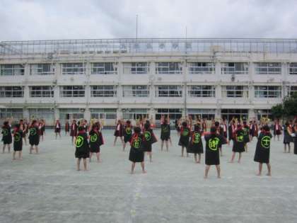 本番と同じ衣装を着け、鳴子を持つことで、いっそうやる気が出てきた子どもたち。今日は校庭で入場から退場まで通して練習をしました。