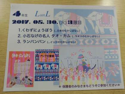 今年度、最初のLアンLでした。子どもたちは本の展開を楽しみながら、読み聞かせに聞き入っていました。最後には、運動会で取り組んだ「ソーラン節」の歌詞についても話していただくことができました。教室前に掲示させていただきます。今年度も、楽しいLアンLをよろしくお願いいたします。