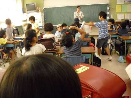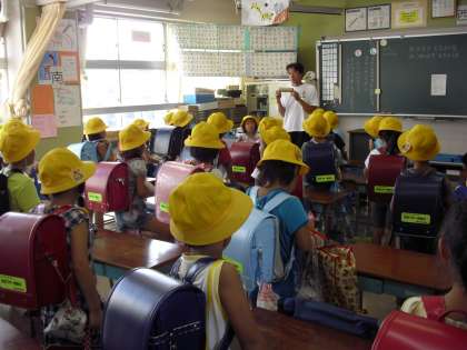 1年生は、忘れ物をしないように、“ランドセル”を背負って先生の話を聞いていました。